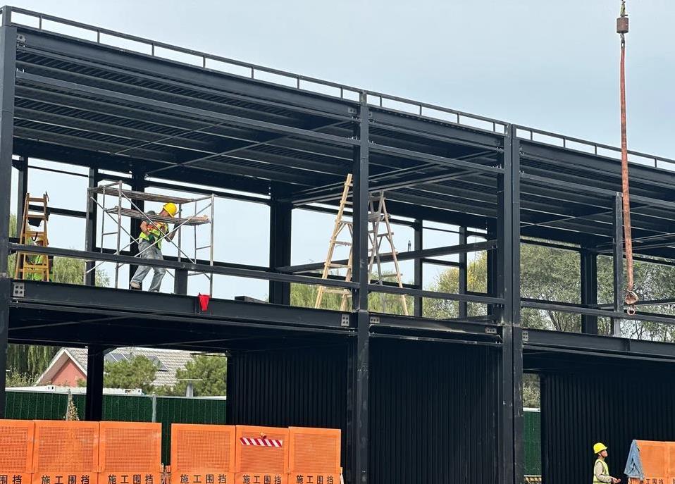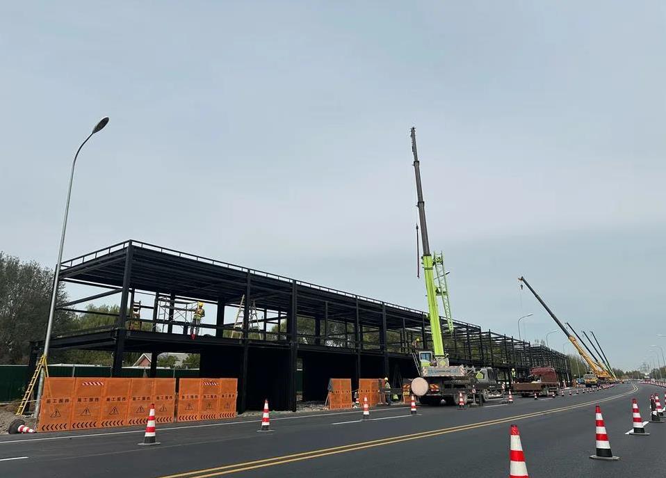 科创十七街上,吊车一字排开,几十米长的起重臂忙着吊装钢结构零件。这些零件拼起来,就是赛车场上的“P房”,也就是车队的后勤基地。P房看着不起眼,却是比赛的核心保障,车队修车、换胎全靠它。施工人员一刻不停,指挥吊车、拼接零件,争取早点把这些“房子”搭好。